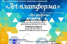 Вокальное объединение "Гармония" продолжает принимать активное участие в творческих конкурсах. И на этот раз пополнила копилку своих достижений Нефёдова Дарья, заняв 3 место в Международном конкурсе творческих достижений "Art-platform", в номинации вокал-соло! Руководитель Агафонова Э.И.