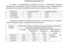 Уважаемые руководители! В связи с установившейся морозной погодой в Республике Татарстан Министерство образования и науки Республики Татарстан (далее - Министерство) рекомендует при низкой температуре воздуха приостановить учебные занятия...