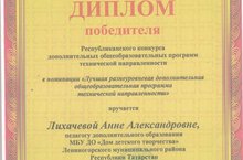 ПДО МБУДО «ДДТ» МО «ЛМР» Лихачева А.А. стала победителем Республиканского конкурса дополнительных общеобразовательных программ технической направленности в номинации «Лучшая разноуровневая дополнительная общеобразовательная программа технической направленности»