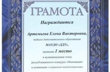 Поздравляем педагогов дополнительного образования Мингазову Фанию Зинатовну, Артемьеву Елену Викторорвну, занявших I место в муниципальном этапе республиканского конкурса «Инновация». 19.11.2015