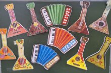 оригинальные рисунки народных инструментов – гармони и балалаек.