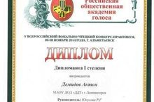 Поздравляем учащихся Дома детского творчества, Демидова Антона, занявшего I место и Кашапову Элину, занявшую 2 место в V Всероссийском вокально-чтецком конкурсе-практикуме, проходившем в г. Альметьевск 6-8 ноября. Желаем дальнейших творческих успехов ребятам и профессиональных успехов их педагогу по вокалу Юнусовой Рушание Гакифовне! ПОЗДРАВЛЯЕМ!!!!! 11.11.2014