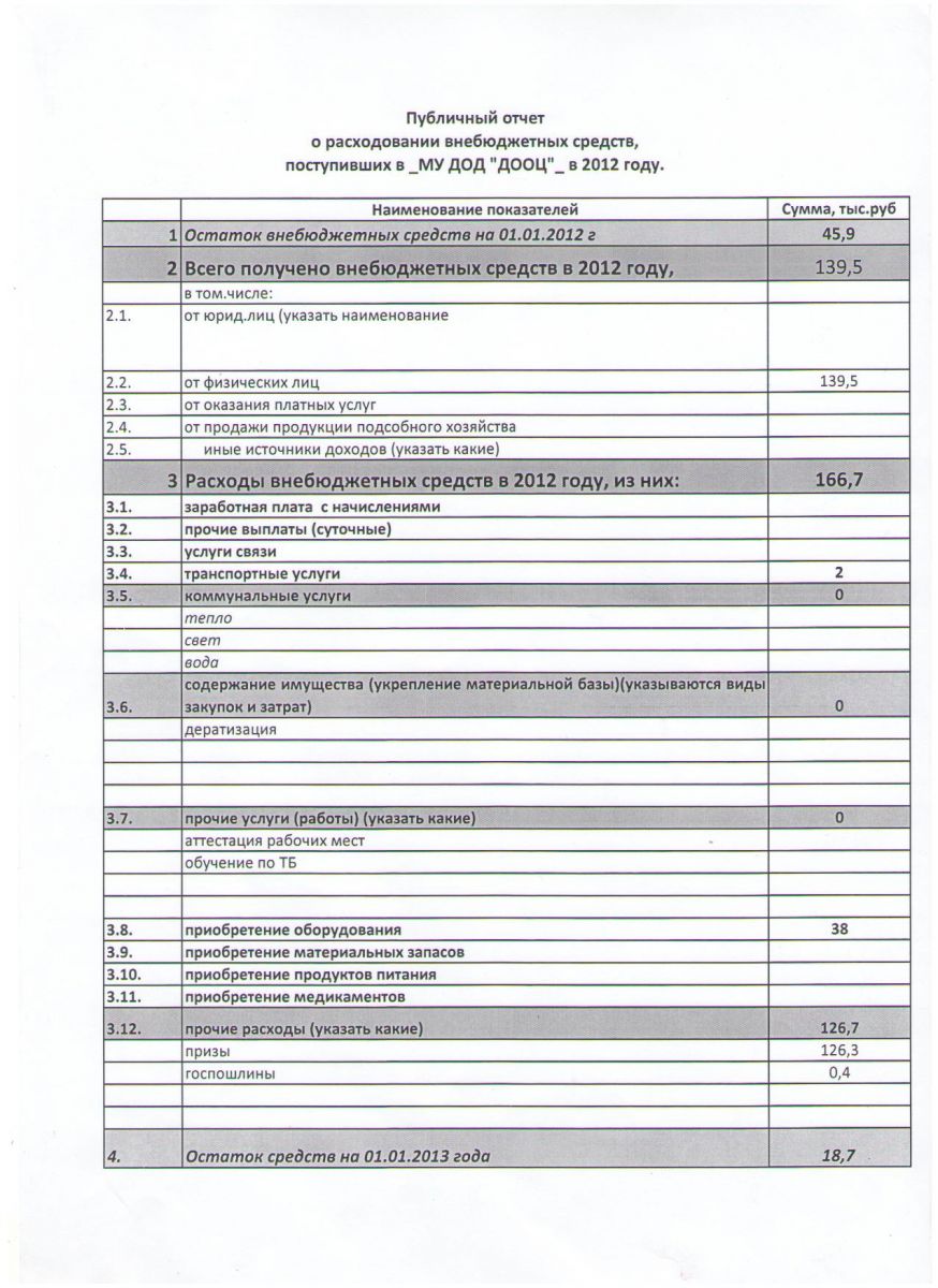 Отчет о поступлении и расходовании внебюджетных средств за 2012год