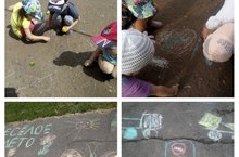 Воспитанники второй младшей группы совместно с воспитателем сегодня стали настоящими художниками – своими рисунками превратили серую асфальтную площадку в летнюю яркую полянку.