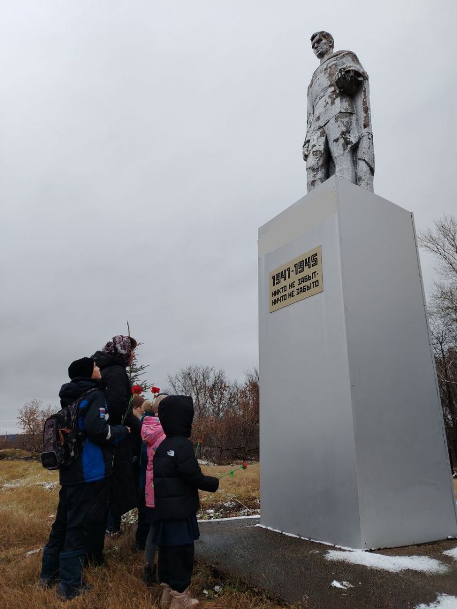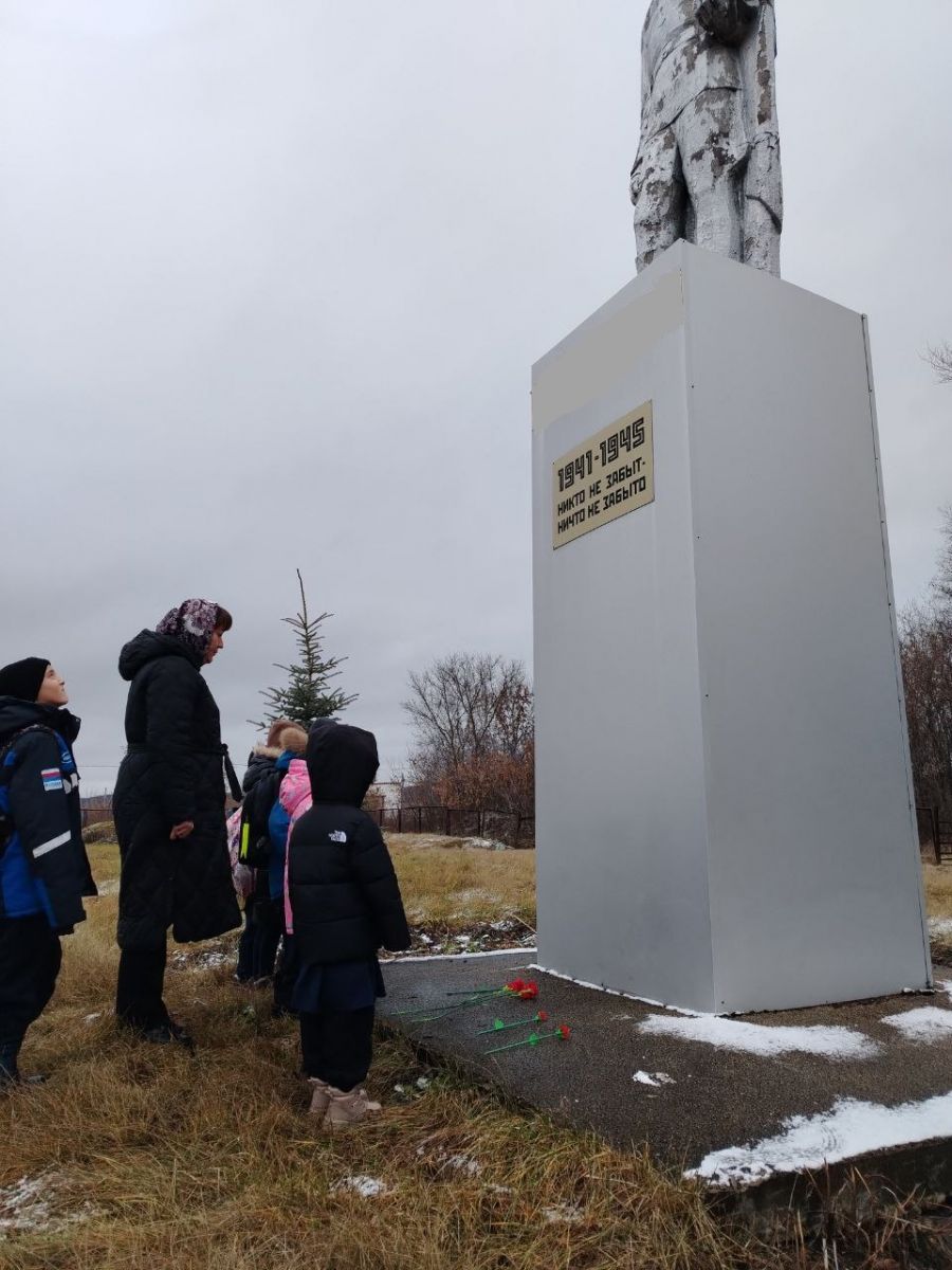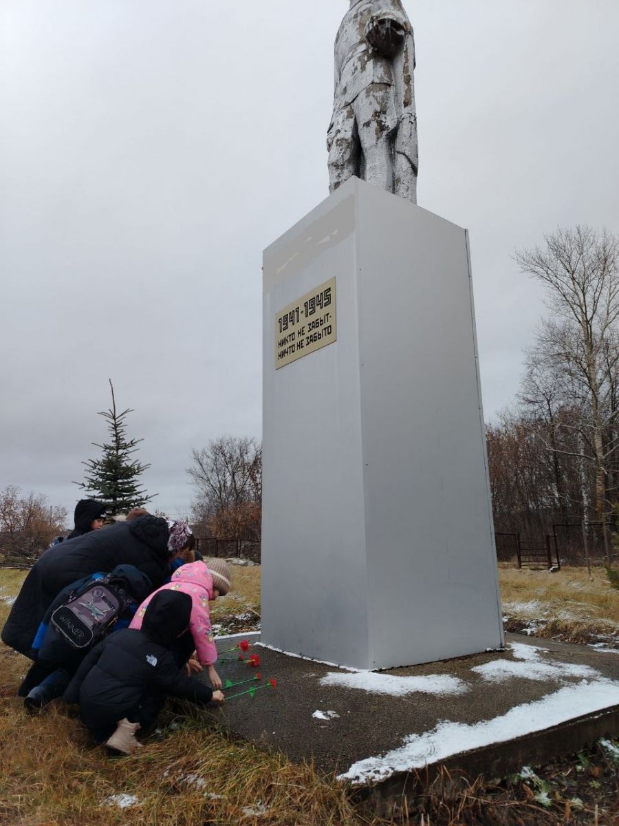 3. Торжественное возложение. С изготовленными цветами ученики проследовали к памятнику. В торжественной обстановке дети возложили алые гвоздики, почтив таким образом минутой молчания память павших героев.