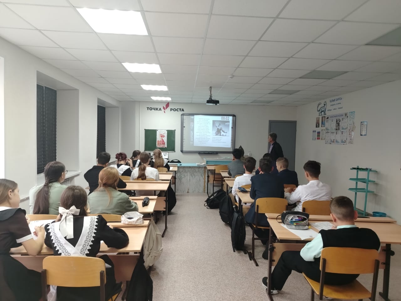 Учитель истории Бобкова Евгения Юрьевна и советник директора по воспитанию Вахромова Елена Юрьевна рассказали о значении Битвы за Москву, о стратегических планах обеих сторон, а также о мужестве и стойкости защитников столицы. Учащиеся узнали о том, как именно проходили сражения, какие трудности пришлось преодолеть нашим войскам и как жители Москвы поддерживали фронт.