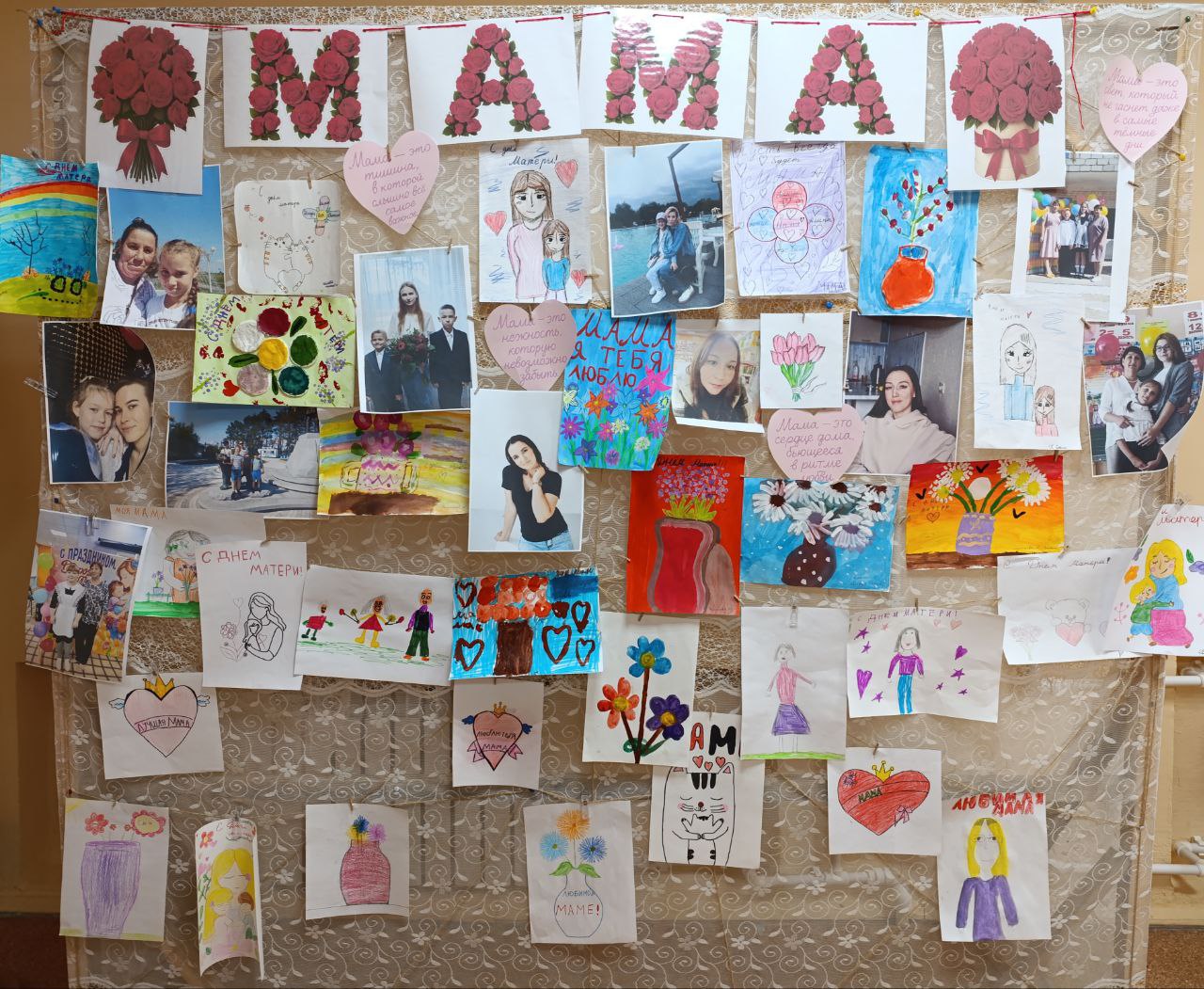 В холле школы развернулась масштабная выставка «Мама – это вселенная». Стенд был украшен фотографиями, детскими рисунками где каждый ребенок по-своему изобразил свою маму как центр своего маленького мира.