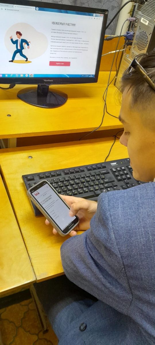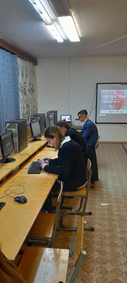 6 декабря в нашей школе прошла Международная акция «ТЕСТ ПО ИСТОРИИ ВЕЛИКОЙ ОТЕЧЕСТВЕННОЙ ВОЙНЫ». Тест проводится с целью оценки уровня исторической грамотности граждан Российской Федерации, соотечественников, проживающих за рубежом, об отечественной истории, для привлечения внимания к получению знаний об отечественной истории. За сорок минут участники акции ответили на сорок вопросов о поворотных событиях Великой Отечественной войны, важных исторических датах и памятных местах, военных операциях и известных исторических личностях. В конце учащиеся получили сертификаты участников.