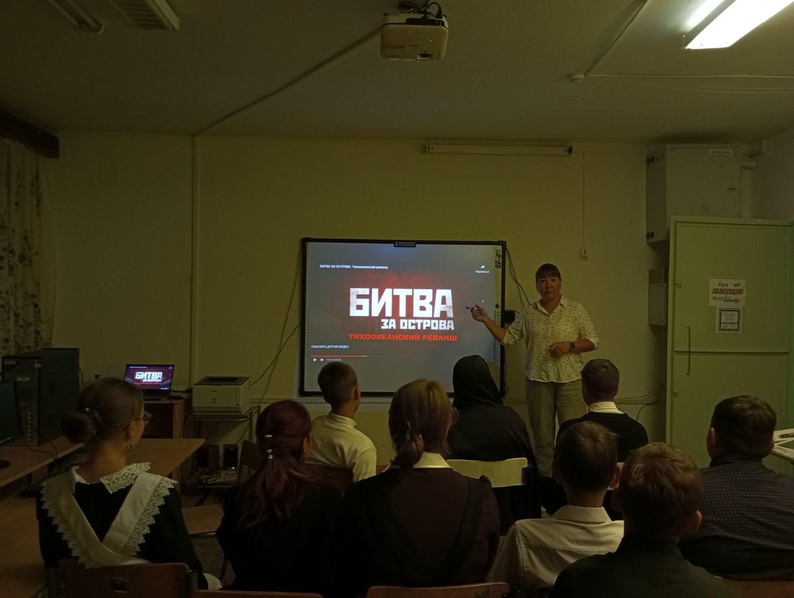 Сегодня в рамках этой даты, советник директора по воспитанию провела кинолекторий "Кадры Победы". Обучающиеся посмотрели кинокартину: «Битва за острова. Тихоокеанский реванш».