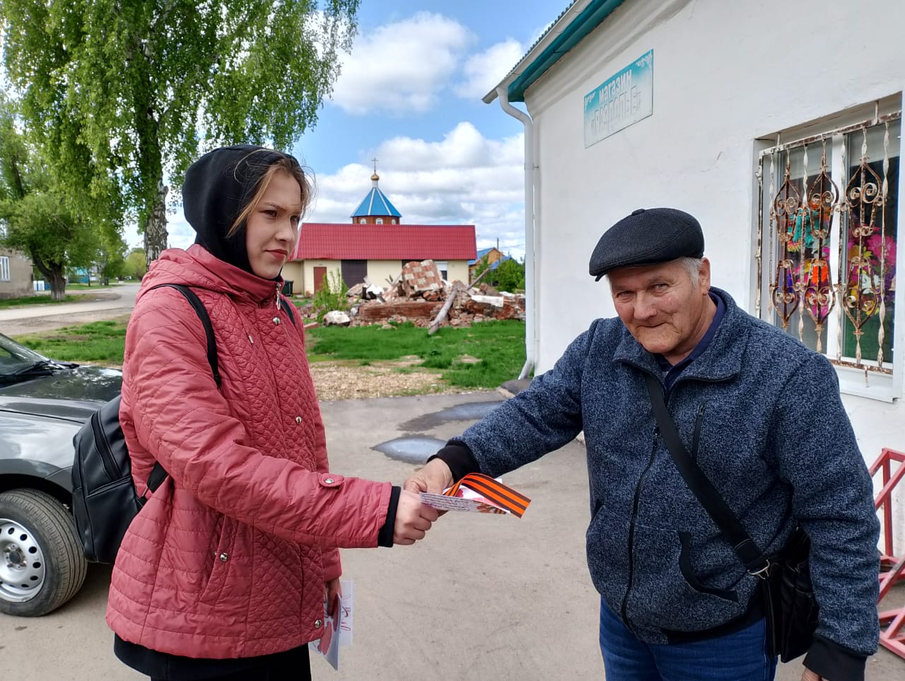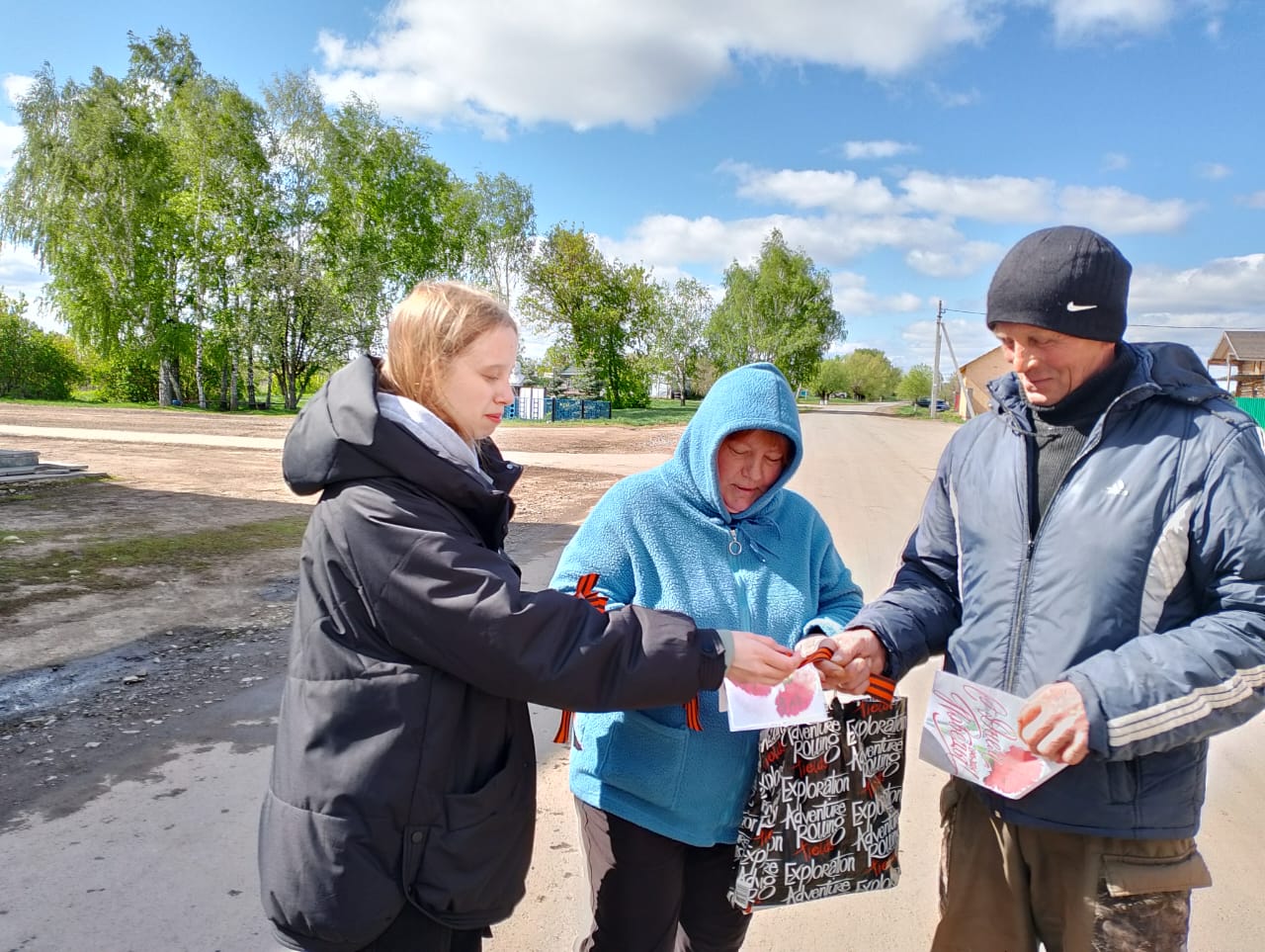 Сегодня активисты нашей школы раздавали Георгиевские ленточки и поздравительные открытки жителям села.