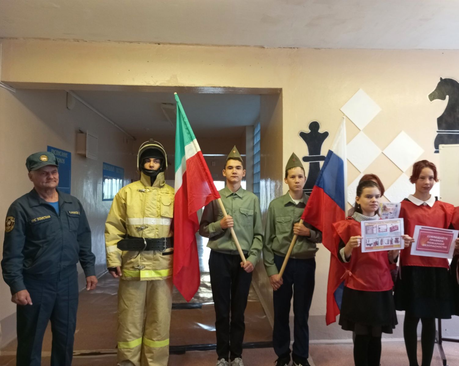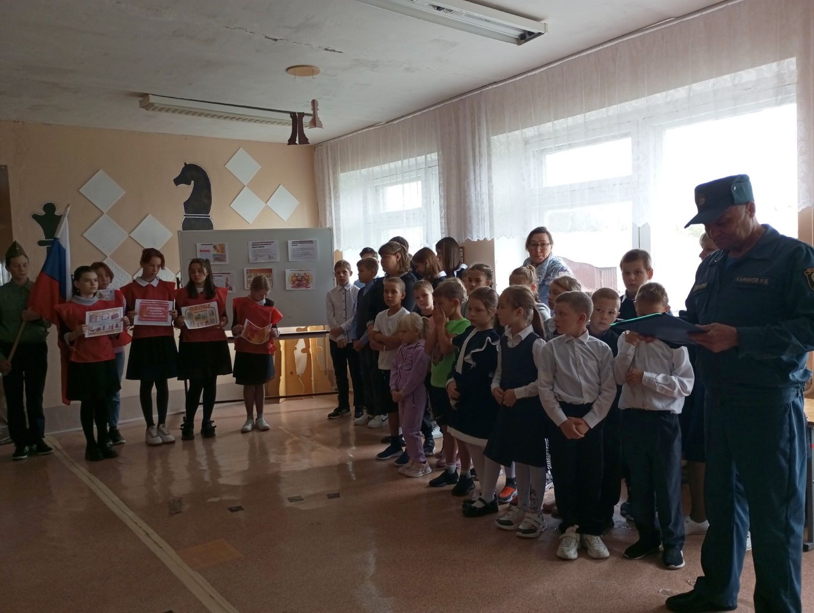 На линейке выступил начальник ОП с. Федотовка Каримов И.Б. Он провёл интересную викторину и рассказал, как вести себя при возникновении пожара. Одному из учеников 8 класса доверилось примерить форму пожарных-спасателей.