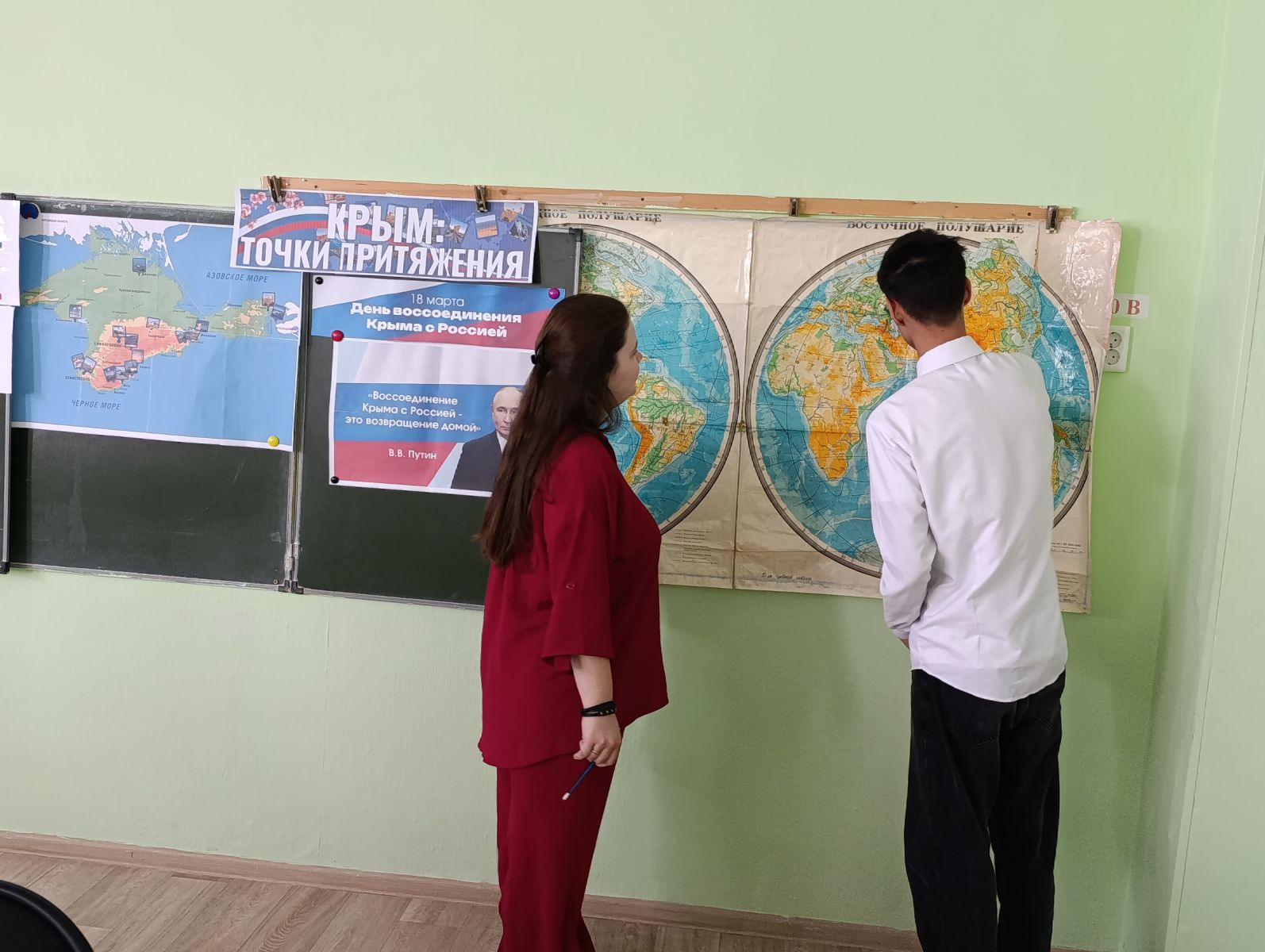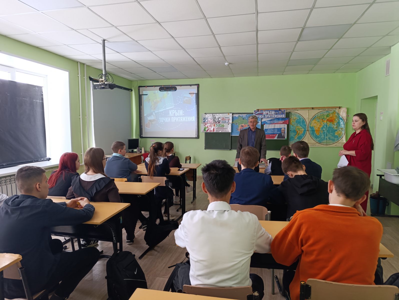 В МБОУ "Старокувакская СОШ " учителем истории Бобковой Е.Ю. и учителем географии Трофимовым Л. В. было проведено мероприятие «Крым: точки притяжения» посвященное Дню воссоединения Крыма с Россией.
