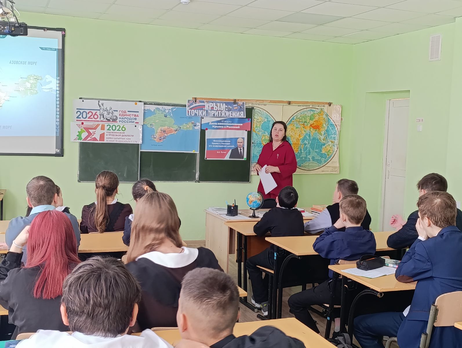 В МБОУ «Старокувакская СОШ» советником директора по воспитанию Вахромовой Е.Ю. и педагогом-организатором Сушковой А.С. были проведены тематические мероприятия, приуроченные к важной исторической дате — Дню воссоединения Крыма с Россией.