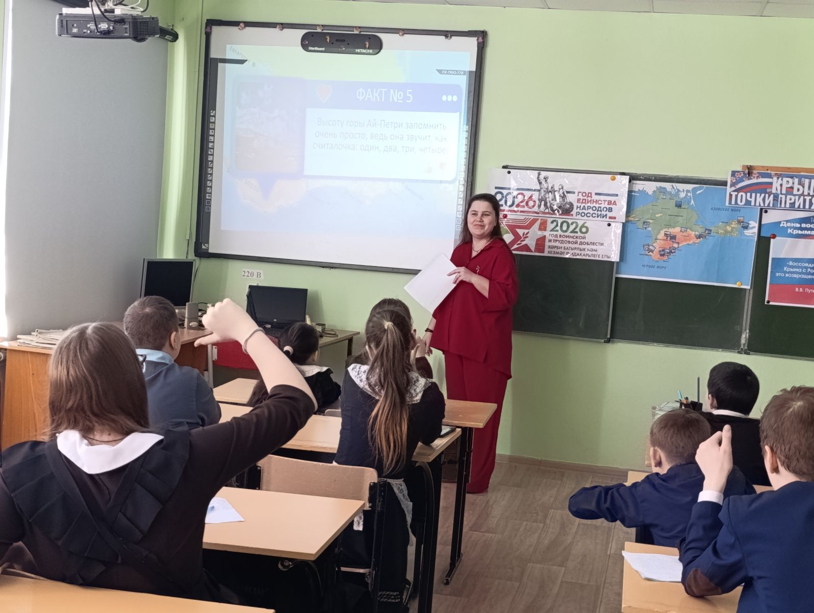 Учитель географии рассказал ученикам о референдуме, на котором жители Крыма выразили желание присоединиться к России. Затем учитель истории провела увлекательную викторину.