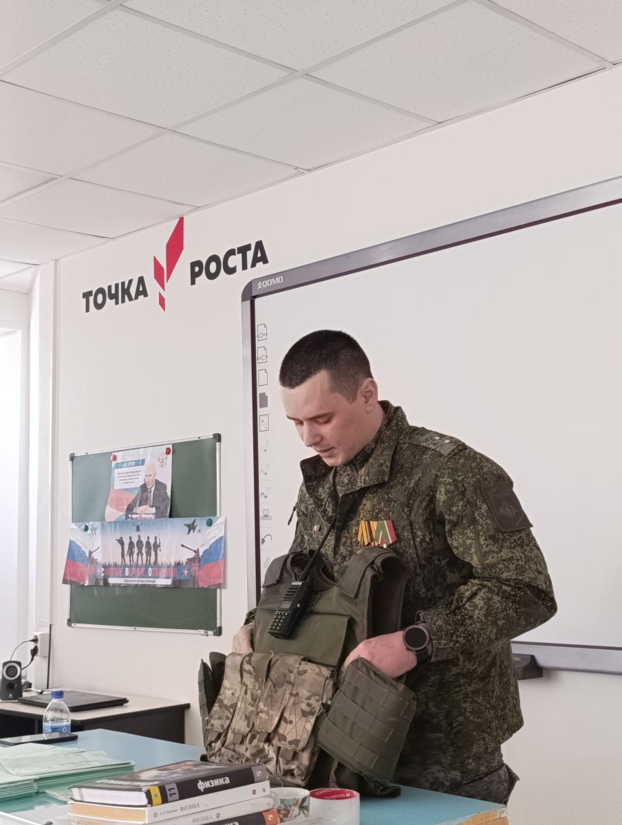 Пришёл он не с пустыми руками. Виктор Николаевич принёс с собой настоящий бронежилет, который ребята тут же захотели примерить и убедились, насколько это серьёзная ноша. Но главным экспонатом стал специальный рюкзак, который раскладывается и превращается в набор для спасения. Внутри — все необходимые медикаменты, которые бойцы носят с собой. Виктор Николаевич подробно рассказал ребятам, для чего нужен каждый предмет и как приходится работать в полевых условиях, спасая людей.
