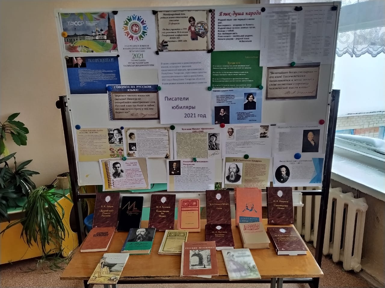 Халыкара туган телләр көненә багышланган айлык кысаларында безнең мәктәп фойесында 2021 нче елгы юбиляр язучыларның һәм шагыйрьләрнең китаплары күргәзмәсе оештырылды. Шунда ук юбилярлар турында мәгълүмат тәкъдим ителде. Мәктәп укучылары үз укытучылары белән бирегә үзләре өчен бик күп кызыклы һәм файдалы мәгълүмат ачу өчен киләләр.