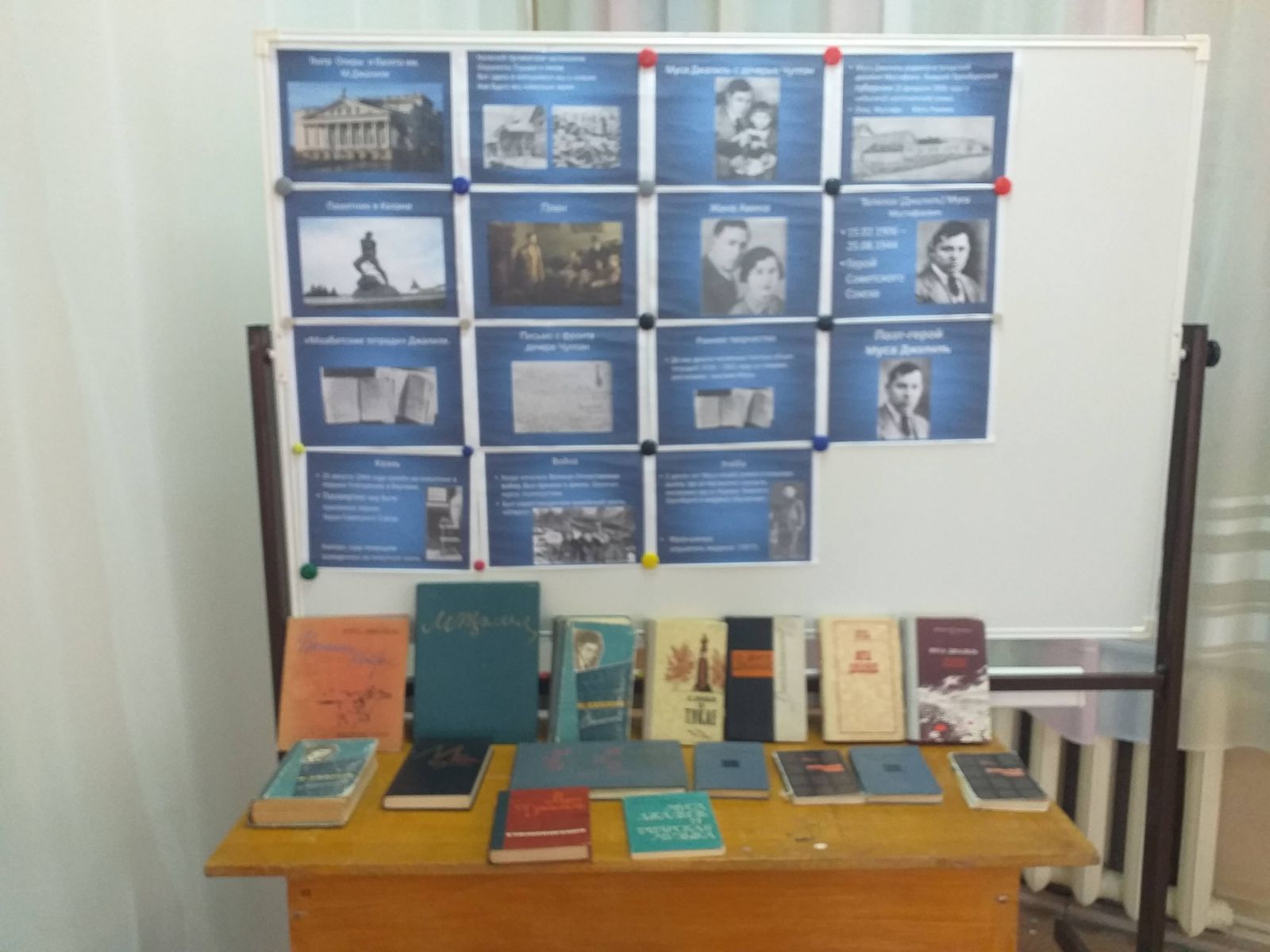 15 февраля учителем родного языка Якуповой Г.М. и библиотекарем Шилкиной Н.В. был оформлен информационный стенд и библиотечная выставка, посвященная Герою Советского союза поэту-патриоту Мусе Джалилю.