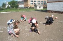 Под девизом «Волю желаниям» ребята пришкольного лагеря снова вышли рисовать на асфальте. Каждый рисовал что он желал. Вожатые не давали команды рисовать одну картину, но получилось так, что сидя в разных местах, у отряда получилось нарисовать цельный рисунок. Это показывает их сплоченность.