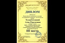 Поздравляем победителей Всероссийской дистанционной олтмпиады по истории "За страницами учебника":ученика 6 класса Габидуллина Айрата (диплом 3 степени), ученицу 7 класса Тухватуллину Алию (диплом 3 степени).