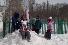 Своими силами мы соорудили горку и пока она не расстаяла нужно быстро прокатиться.
