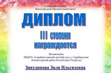 Наша воспитанница, средней подгруппы- Зиятдинова Зиля, награждена дипломом III степени за победу в конкурсе, посвященном Дню Победы "Никто не забыт и ничто не забыто!"
