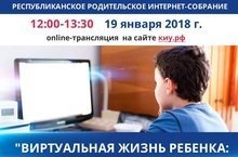 Во исполнение плана работы Министерства образования и науки Республики Татарстан 19.01.2018 с 12.00 до 13.30 состоится Республиканское родительское интернет-собрание «Виртуальная жизнь ребенка: интернет – друг или враг?».Он-лайн трансляция собрания будет вестись на сайте Казанского инновационного университета имени В.Г.Тимирясова по адресу: https://ieml.ru/. -