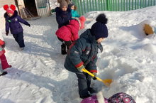 После обильного снегопада мы все дружно вышли на уборку снега.