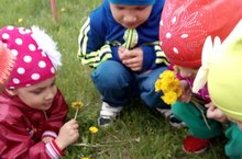 На прогулке мы наблюдали как пчелы собирают нектар с одуванчиков.