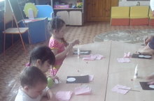 С большой заинтересованностью детки вырезали круги и выполнили аппликацию снеговика и дорисовали ему лицо.