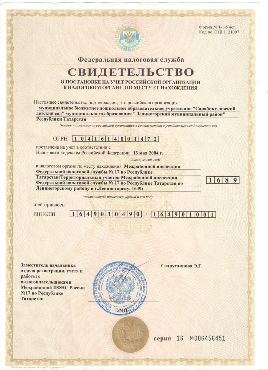 Свидетельство о постановке на учет российской организации в налоговом органе по месту ее нахождения