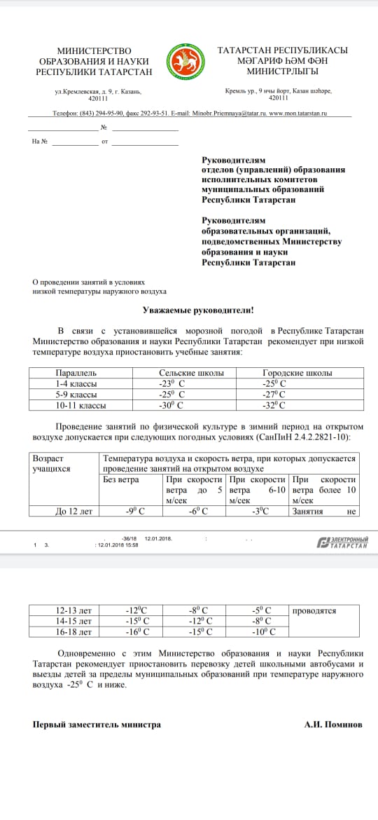 О проведении занятий в условиях низкой температуры наружного воздуха