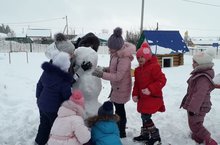 Мәктәпкә әзерлек төркеме 4 нче класс укучылары белән берлектә саф һавада йөргәндә сезонлы үзгәрүләрне күзәтте. Балалар баштан һәва торышының үзгәрүе турында сөйләштеләр, аннары җепшек кардан Кар бабай ясадылар