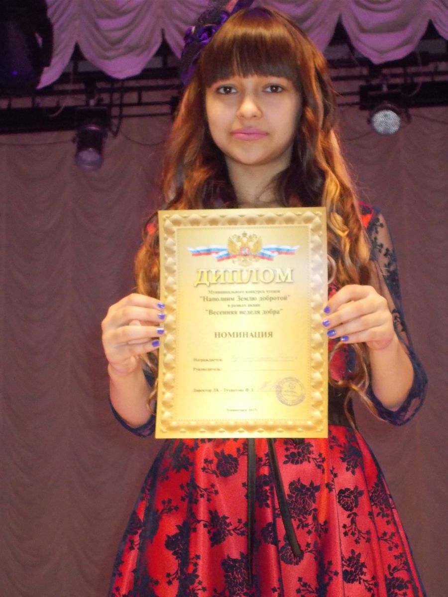 Поздравляем ученицу 5 класса Шалкину Екатерину, занявшую 2 место в Муниципальном конкурсе чтецов "Наполним Землю добротой" в рамках акции "Весенняя неделя добра" за исполнение стихотворения Ольги Николаевой "Счастье"; учениц 6 класса Асабину Викторию и 7 класса Хуббатуллину Регину, получивших дипломы в номинации "Дебют" конкурса.