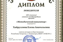 Поздравляем Хайруллину Елену Анатольевну с дипломом победителя 3 степени в сетевом международном проекте «Методический навигатор», целью которого является изучение, систематизация и отбор электронных образовательных ресурсов и сетевых сервисов web 2.0. для работы на уроке и во внеурочной деятельности. Пусть удача сопутствует Вам во всех делах и в жизни будет множество интересных и восхитительных событий!