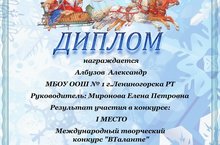 Поздравляем Албузова А. , ученика 3 класса и его руководителя Миронову Е.П. с 1 местом в международном творческом конкурсе "ВТаланте" за работу "Зимняя сказка". Желаем им дальнейших творческих успехов!