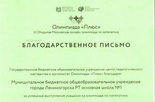С 1 по 4 декабря 2015 года 18 учеников начальной школы приняли участие в III Открытой Московской онлайн олимпиаде по математике Олимпиада «Плюс», организованной Департаментом образования города Москвы и Центром педагогического мастерства.Участники Олимпиады показали высокие результаты при выполнении математических заданий: 7 учеников – ПОБЕДИТЕЛИ – награждены Дипломами Олимпиады: учащиеся 3 класса (учитель Миронова Е.П.) Юсупов Р., Тимошин С., Албузов А., Хайретдинова Э., учащиеся 2 класса (учитель Князькина Т.И.) Албузова В., Мосолов И., Журавлева Н. 9 учеников – ПРИЗЕРЫ – получили Похвальные грамоты. Оргкомитет Олимпиады «Плюс» выразил Благодарность педагогическому коллективу МБОУ «ООШ №1» за успешное выступление учеников. -