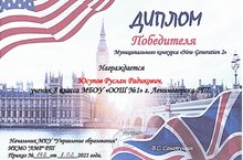 Поздравляем Юсупова Руслана, ученика 8 класса, с победой в муниципальном дистанционном конкурсе по английскому языку и межкультурной коммуникации «New Generation-2».