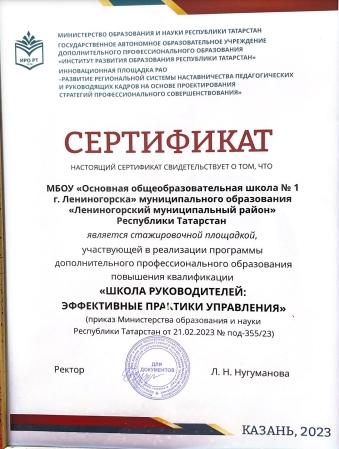Руководитель стажировки Смирнов Иван Андреевич, доцент кафедры педагогики и управления образованием ИРО РТ вручил директору школы №1 Васильевой Нине Николаевне сертификат стажировочной площадки, участвующей в реализации программы дополнительного образования повышения квалификации "Школа руководителей: эффективные практики управления".