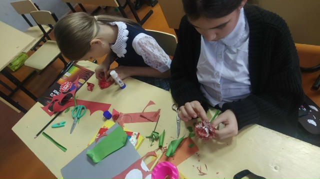 В честь этого сегодня советник по воспитанию Ибрагимова С.З. рассказала учащимся 4 класса об истории праздника и провела мастер - класс по изготовлению гвоздики.