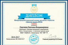 Поздрвляем Сергееву Светлану Влагодимировну - победителя Международного творческого конурсв для детей и педагогов "Золотая медаль 2016"