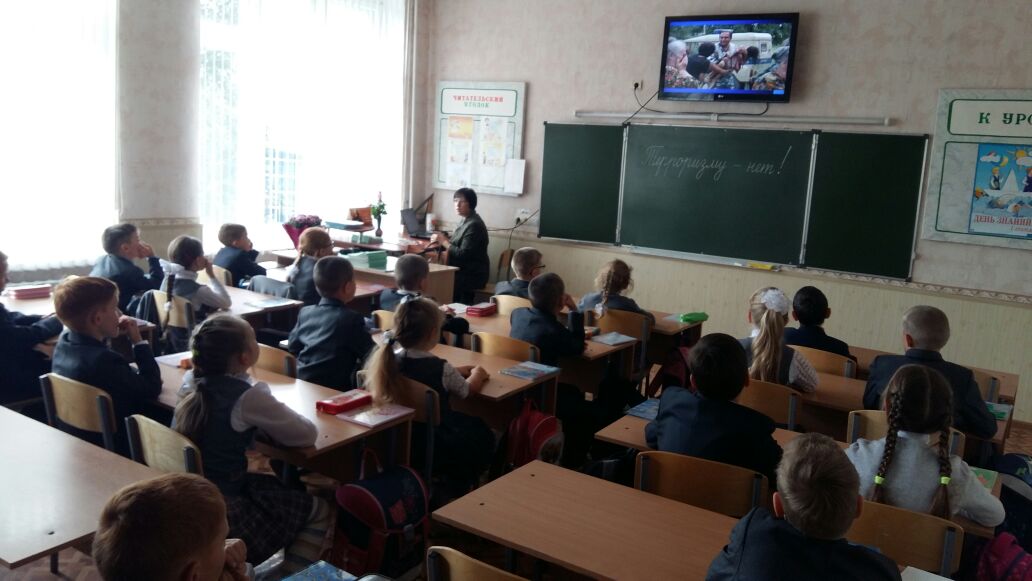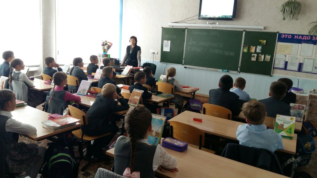 3.09.16 в нашей школе прошли мероприятия, посвященные Дню солидарности в борьбе с терроризмом: Во всех классах прошли классные часы на тему "Терроризм. Беслан", посвященный 12 годовщине трагедии в школе №1 г.Беслана. Были организованы конкурсы рисунков, показаны презентации. В старших классах прошли "Веселые старты". В среднем звене нашей школы, перед учащимися выступила Шарифуллина А.Р. , педагог-организатор ОБЖ, она рассказала им об истории возникновения терроризма, о самых массовых и известных террористических актах современности, о том, как и чем опасно это явление.