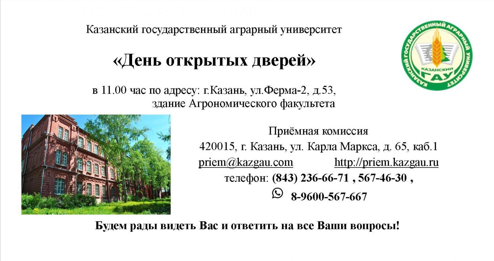В рамках профориентационной работы по привлечению абитуриентов на 2020/2021 учебный год в ФГБОУ ВО Казанский государственный аграрный университет, просим Вас оказать содействие в вопросе информирования школьников о проведении мероприятия «День открытых дверей»