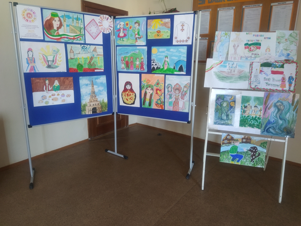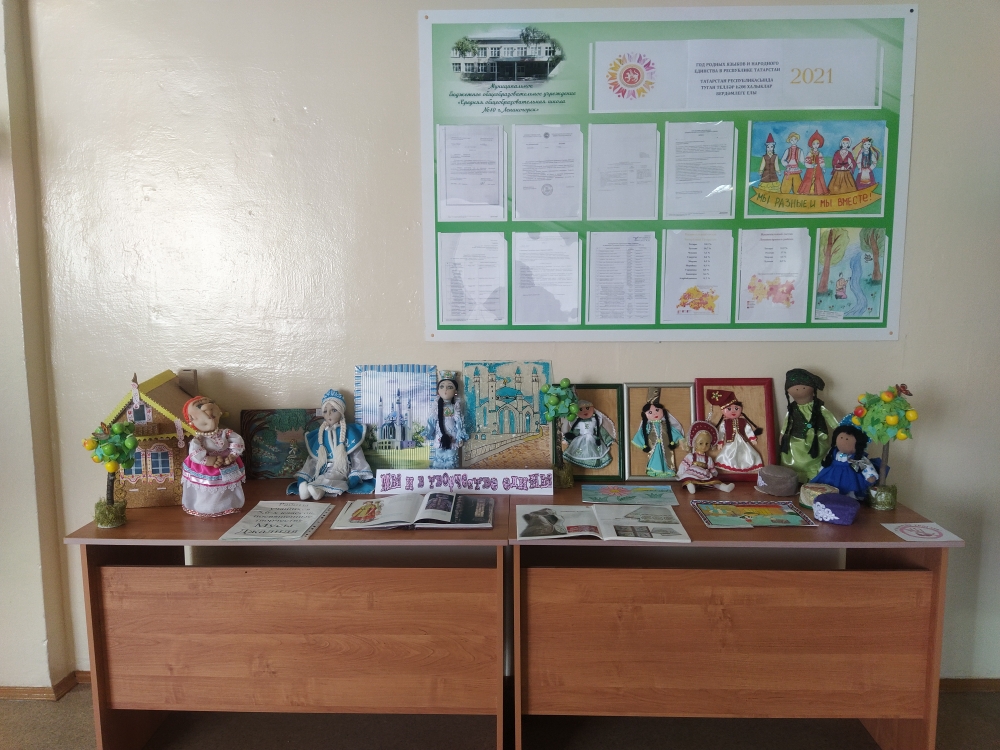 Туган телләр һәм Халыклар бердәмлеге елын үткәрү кысаларында мәктәптә «Без иҗатта да бердәм»дип исемләнгән рәсем һәм кул эшләнмәләре күргәзмәсе оештырылды. Күргәзмәдә 1-9 сыйныф укучыларының эшләре тәкъдим ителде. Эшләр төрле техникаларда башкарылган-бу акварель, гуашь, карандаш,табигый материалдан,тукымадан эшләнмәләр. Алар барысы да оригинальлеге белән аерылып тора, конкурс тематикасына туры килә. Үз эшләрендә балалар күпмилләтле илебезнең матурлыгын, туган урынга мәхәббәт һәм үз халкы өчен горурлык хисләрен гәүдәләндерделәр.