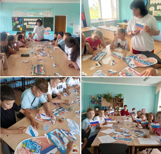 пришкольном лагере ко Дню России под руководством советника директора по воспитанию Зарипова Э.И. с детьми нарисовали российские флаги.