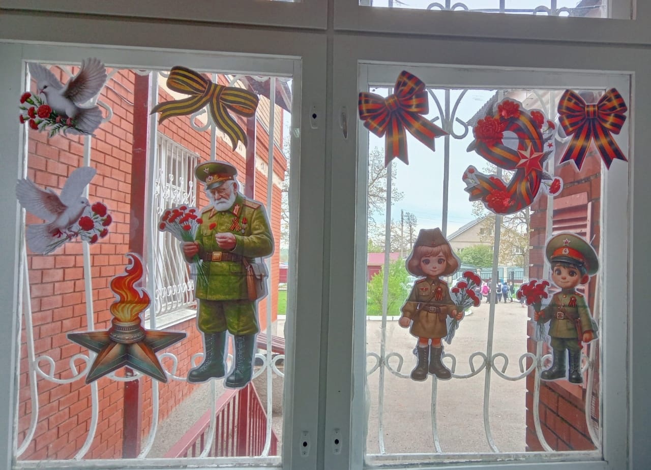 В преддверии празднования Дня Победы, обучающиеся «Волонтеры Победы" и активисты «Движения Первых» нашей школы, совместно с заместителем директора по воспитательной работе А.В. Сергеевной и советником директора Э.И. Зариповой присоединились к акции и оформили окна и здание школы.