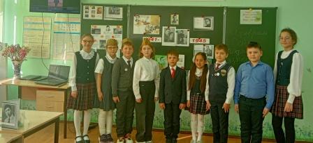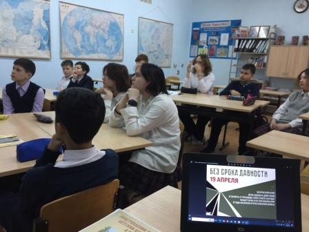 Силами учащихся 8 класса были проведены тематические пятиминутки для учащихся начальных 1-4 классов. Целью этих выступлений было ознакомить их с историей появления Всероссийского Дня единых действий-19 апреля, с определением понятия «геноцид» и подчеркивание важности исторической памяти и уважения к Родине.