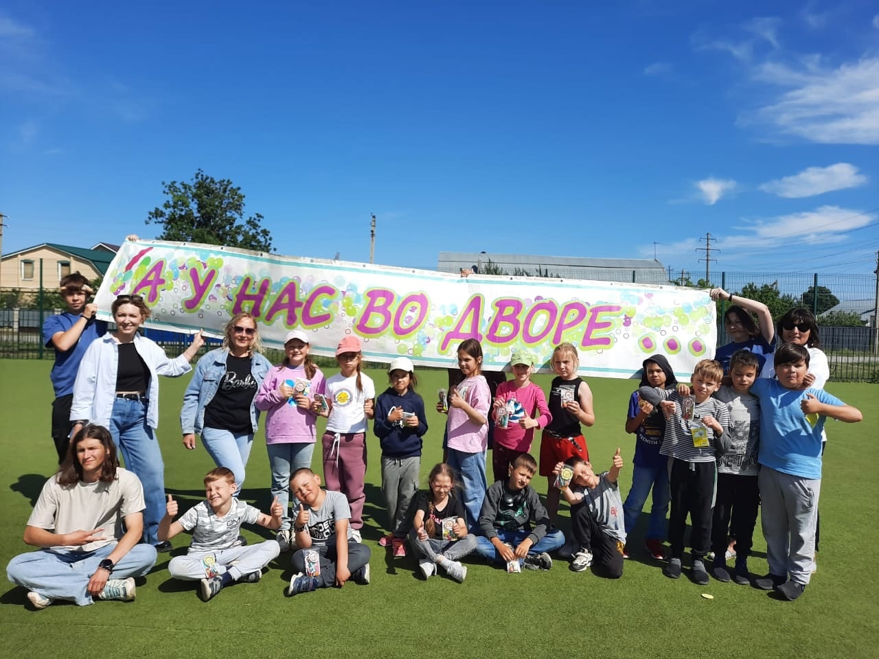 Совместное мероприятие "Сабантуй" с дворовым лагерем .Дети играли в народные игры, соревновались.В конце мероприятия каждому вручили небольшие призы.