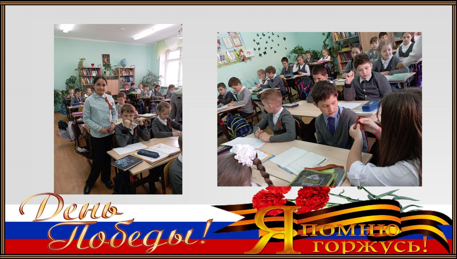 Патриотическая акция «Георгиевская ленточка» впервые прошла в 2005 году по инициативе российских журналистов. Позже она была подхвачена многочисленными молодёжными организациями и объединениями по всей стране. Владимирская область присоединилась к всероссийской акции в 2009 году. Ежегодно на территории 33-го региона под девизом: «Я помню! Я горжусь!» силами представителей молодёжи распространяются тысячи чёрно-оранжевых лент. Вот и сегодня мы не остались в стороне и приняли участи в этой светлой акции. Юнармейцы нашей школы раздавали георгиевские ленточки со словами поздравления с наступающим праздником работникам нашего стекольного завода " Символ".