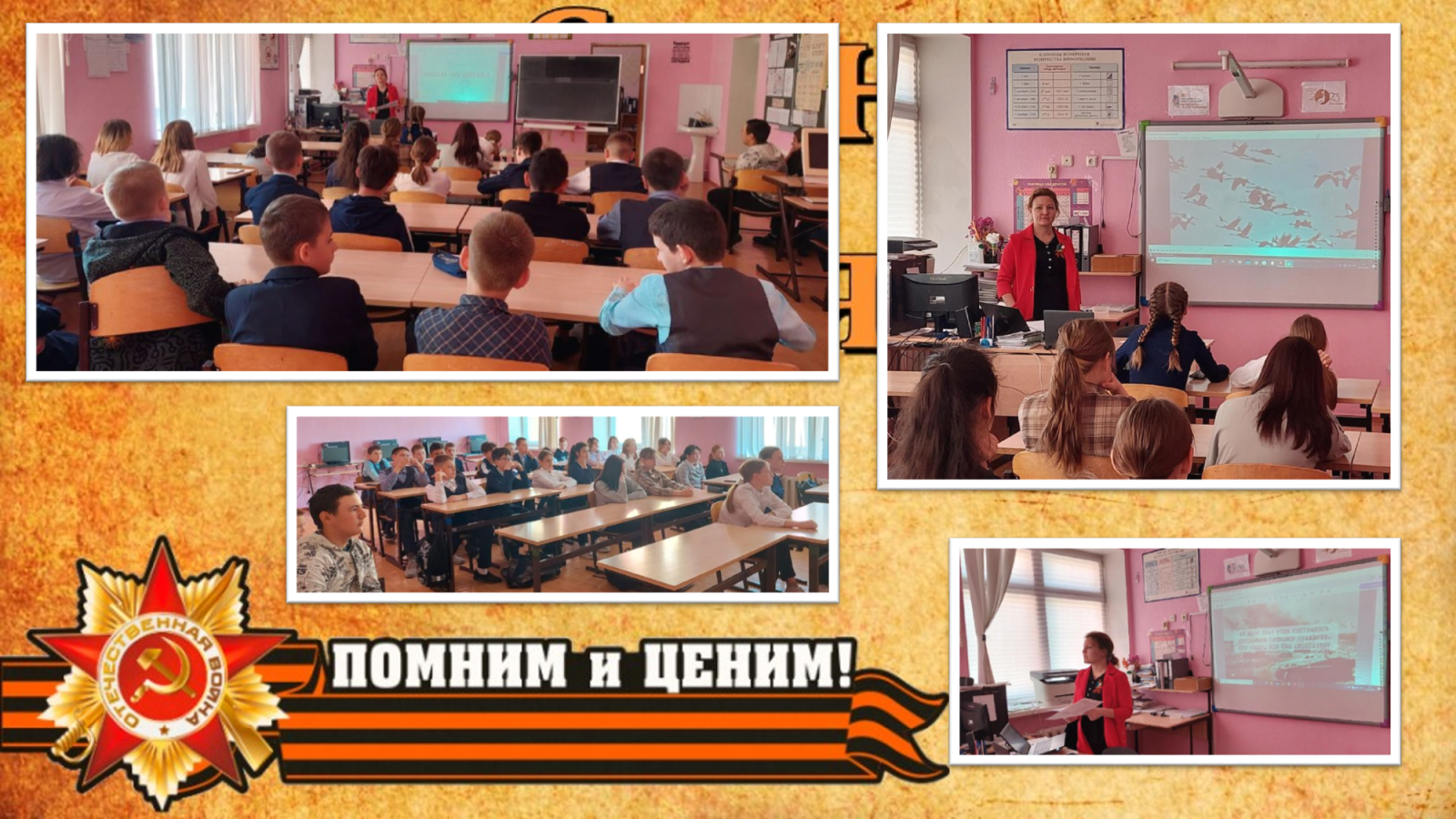 Занятия курса внеурочной деятельности «Разговоры о важном» прошли на тему «День Победы. Бессмертный полк». Обучающиеся вспомнили важные исторические события Великой Отечественной войны: битву за Москву, Сталинградскую битву, битву на Курской дуге и др. Говорили об истории появления движения «Бессмертный полк» и его роли в сохранении памяти о ветеранах. Ребята выступали с рассказами о своих родственниках, воевавших и трудившихся в тылу в годы войны, их вкладе в Великую Победу. Говорили о том, как важно бережно хранить память о тех, кого уже нет рядом с нами, и что долг каждого человека - знать историю своей семьи и страны. Также расширили представления о символах Победы – Георгиевской ленте и знамени Победы. На занятиях прозвучали песни «Журавли», «От героев былых времен».