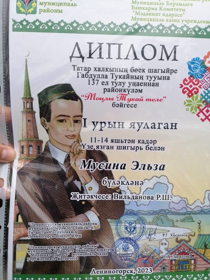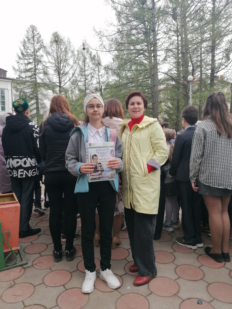 Ученица 7кл СОШ13 заняла 1 место в муниципальном конкурсе "Моңлы Тукай теле". Руководитель: Учитель родного (татарского) языка Вильданова Р. Ш.